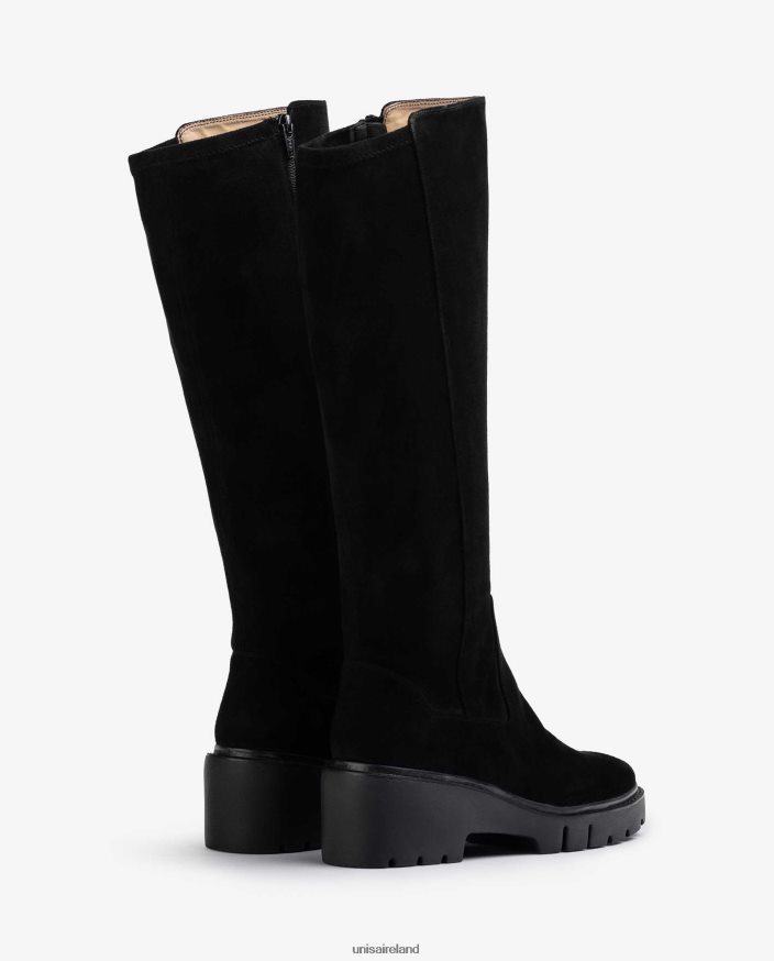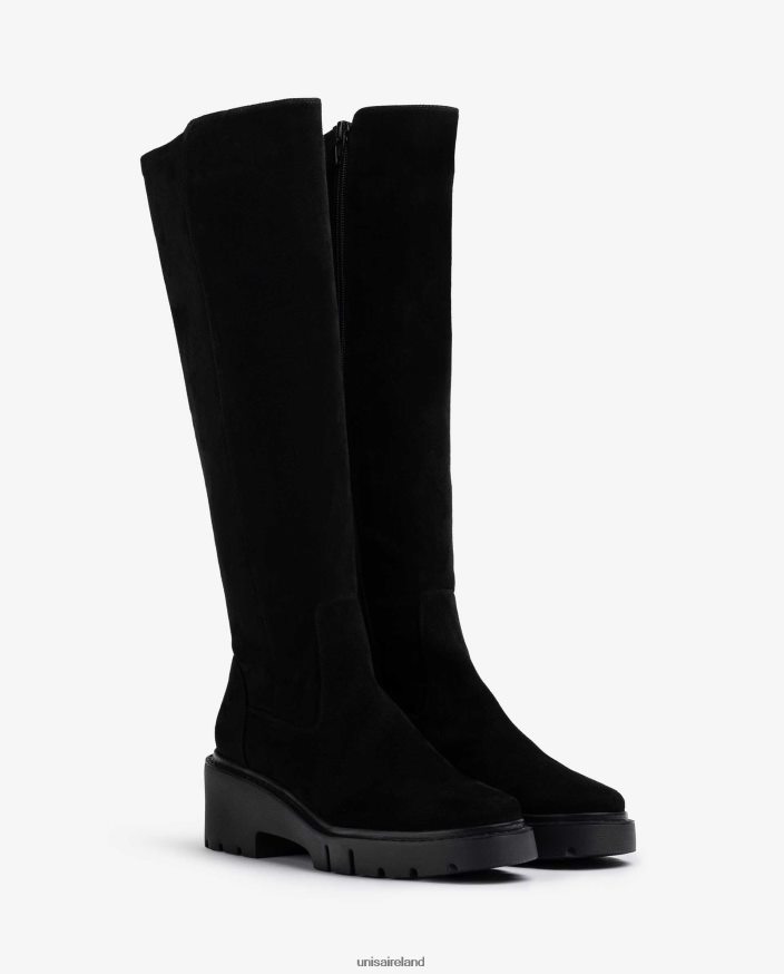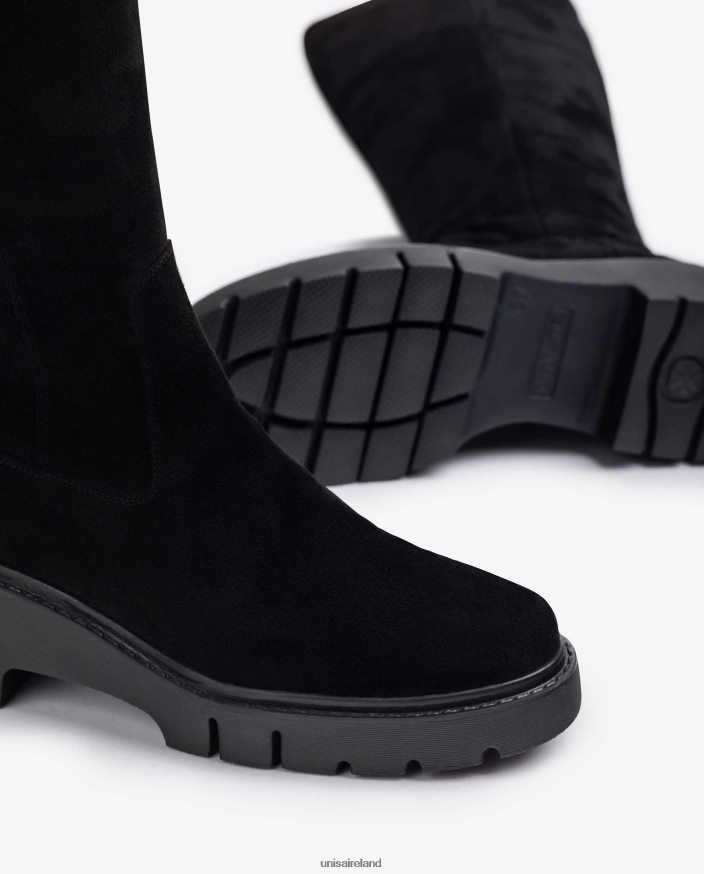 Kid suede effect fabric elastic boots with inner zip. Non-slip, light and flexible rubber track sole, with a 2,3cm platform and a 6cm high heel. An essential pair of boots that will never go out of fashion.