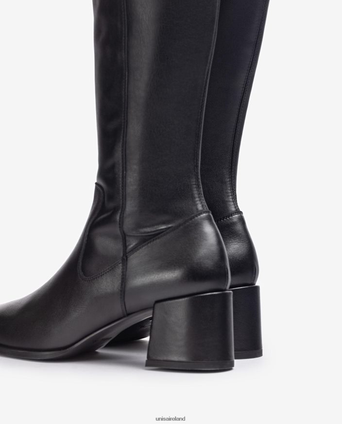 Thigh boots made in leather and leather effect stretch fabric. Matching colour 6cm heel. Light, flexible, non-slip sole. A classic essential in the Unisa world.