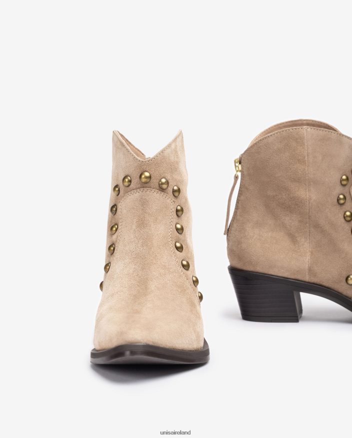 Suede cowboy style boot with a pointed toe. Matching studs on the front and a zip at the back. 5cm high heel and a non-slip, flexible and light rubber sole. A trend that creates a niche for itself in the new UNISA collection.