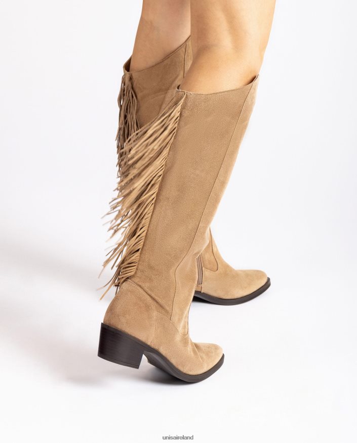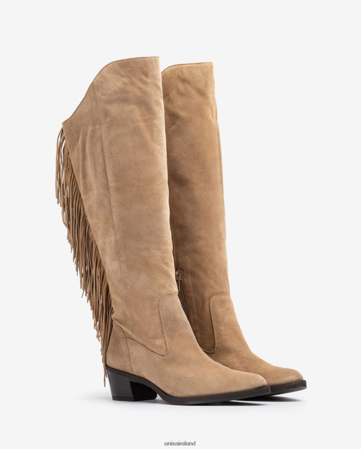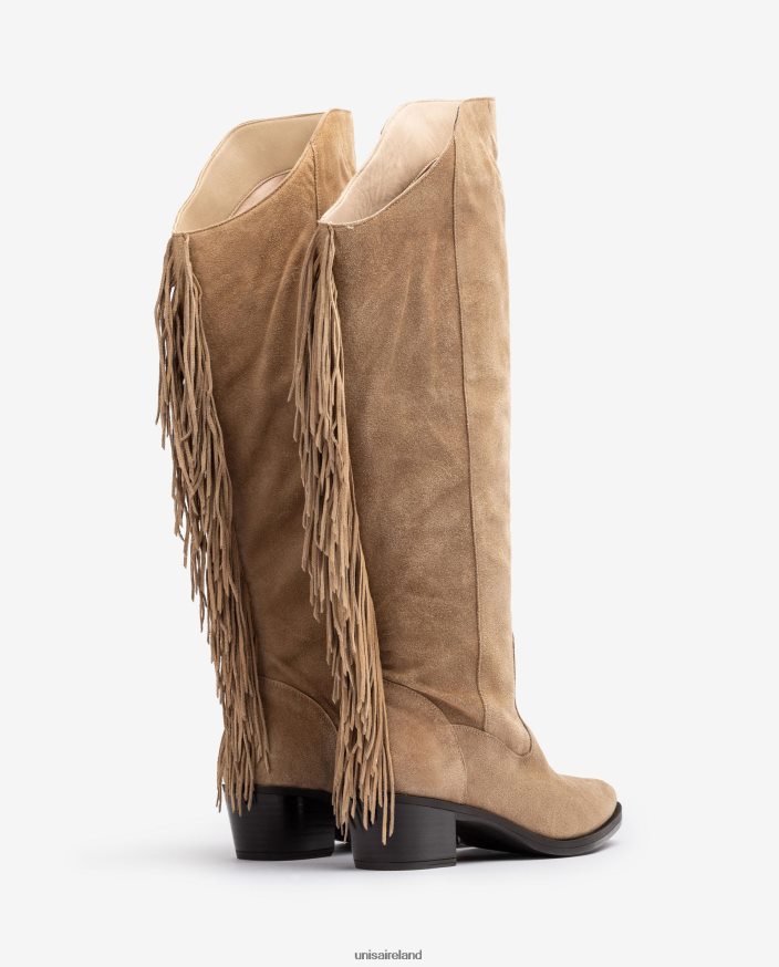 Suede cowboy style boot with tassels on the back of the boot leg. 5cm high heel and a light, flexible and non-slip sole. A trend that has found a niche in the new UNISA collection.