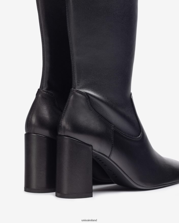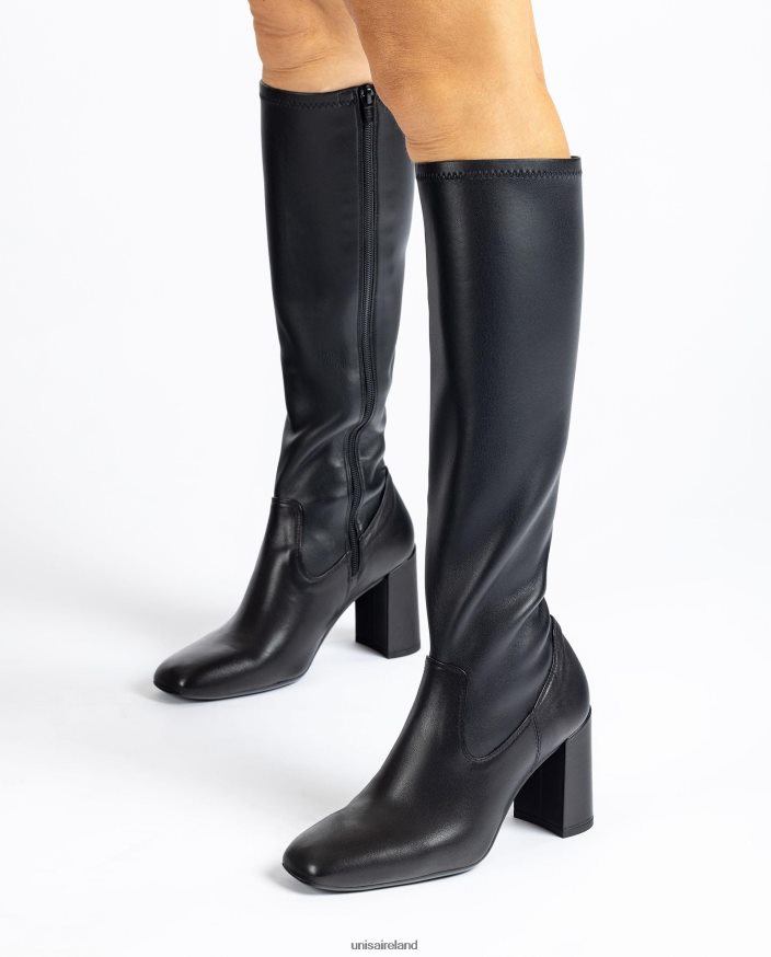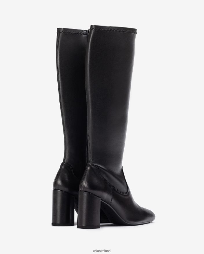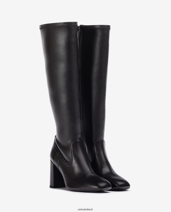 Square toe leather boot with the quarter top line in leather effect stretch leather. Zip on the inside and a heel 8.5cm high. Light, flexible, non-slip rubber sole. The perfect allies for the UNISA woman.