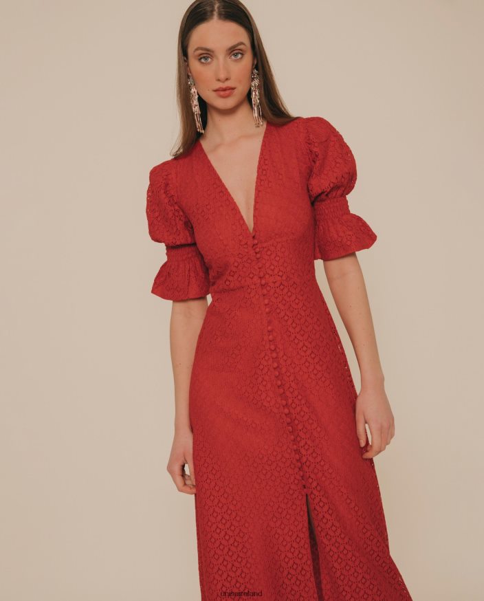 It is a nuanced fit lace midi dress, with an evase skirt. It has a V-neck with a set of buttons below. The puffed sleeves have pleated honeycomb smocking.