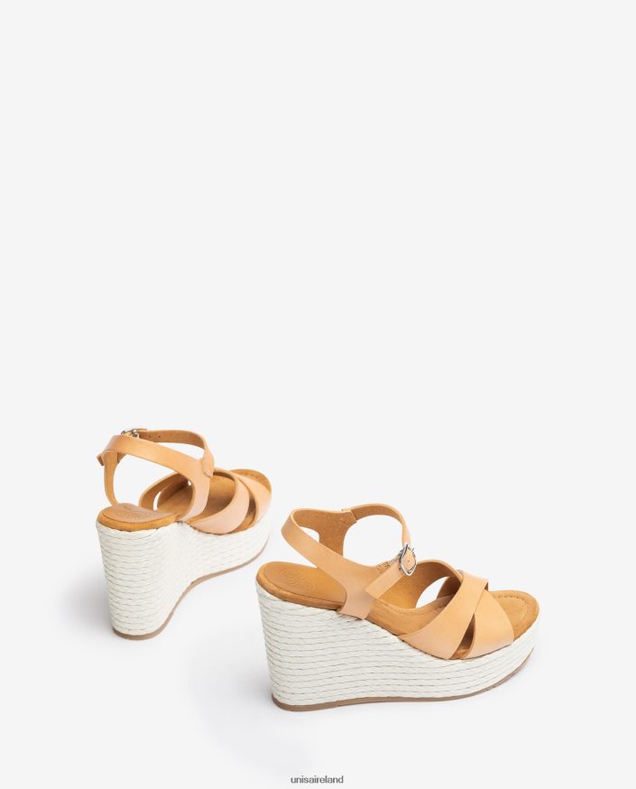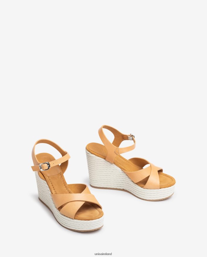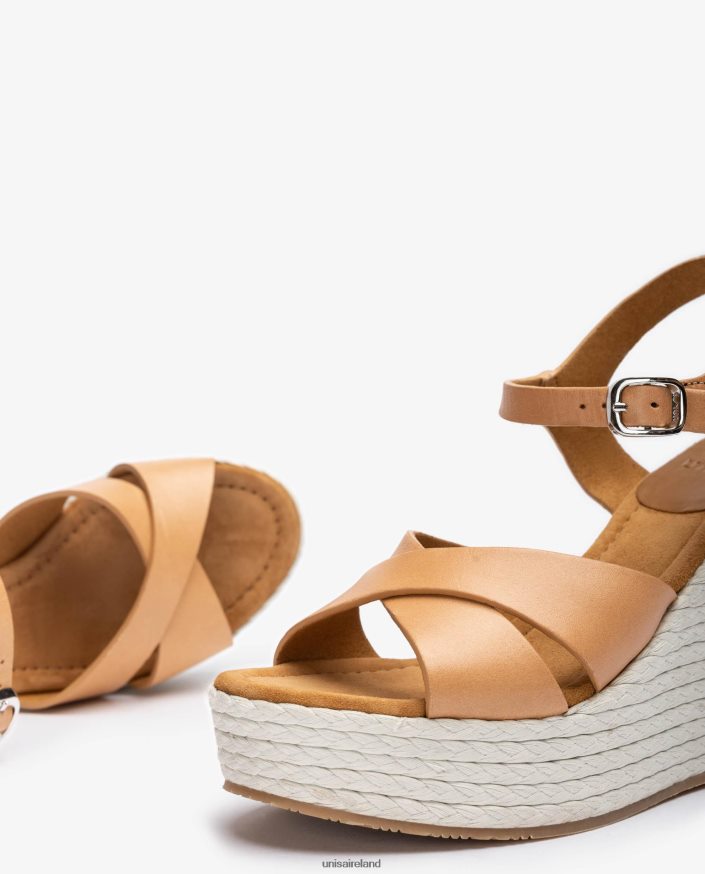 Square toe sandal made in leather. Crossover straps on the front and an ankle strap that can be adjusted using the metal buckle. 10.5cm block heel and 3.5cm platform covered with natural colour cotton braids. Light, non-slip, rubber sole. Our new collection of wedges will surprise you.