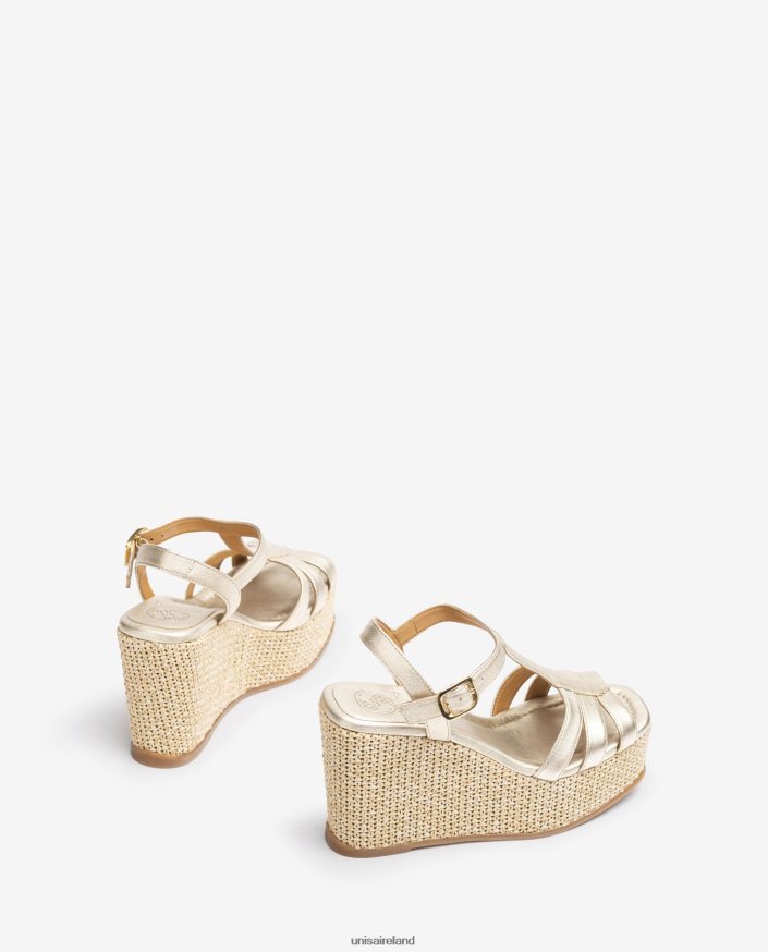 Square toe sandal made in metallic effect leather. Straps on the front and on the instep and an ankle strap that can be adjusted using the metal buckle. 10cm high wedge and a 4cm platform covered with natural raffia. Light, non-slip, rubber sole. Sandals with innovative designs for all your events.