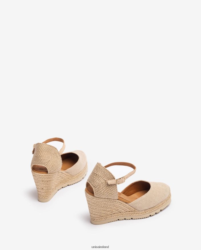 D'Orsay ankle strap round toe espadrille. Made in Ecolino fabric that is made 100% from recycled plastic bottles. 7.5cm high wedge covered in natural colour raffia and a 1cm platform. Lighter and more flexible EVA sole than ever before thanks to the SuperLight technology. Unisa loves the planet!