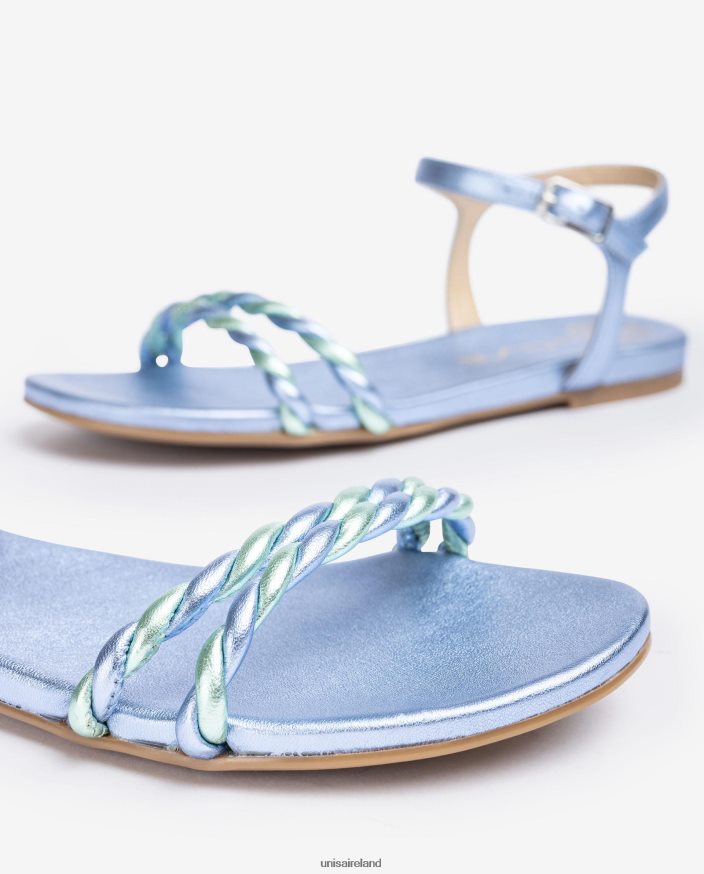 Flat sandal made in metallic effect leather. Tubular spiral straps on the front. Ankle strap that can be adjusted with the metal buckle. Light, flexible, non-slip, rubber sole. Design and comfort provided by Unisa will accompany you in all your steps.