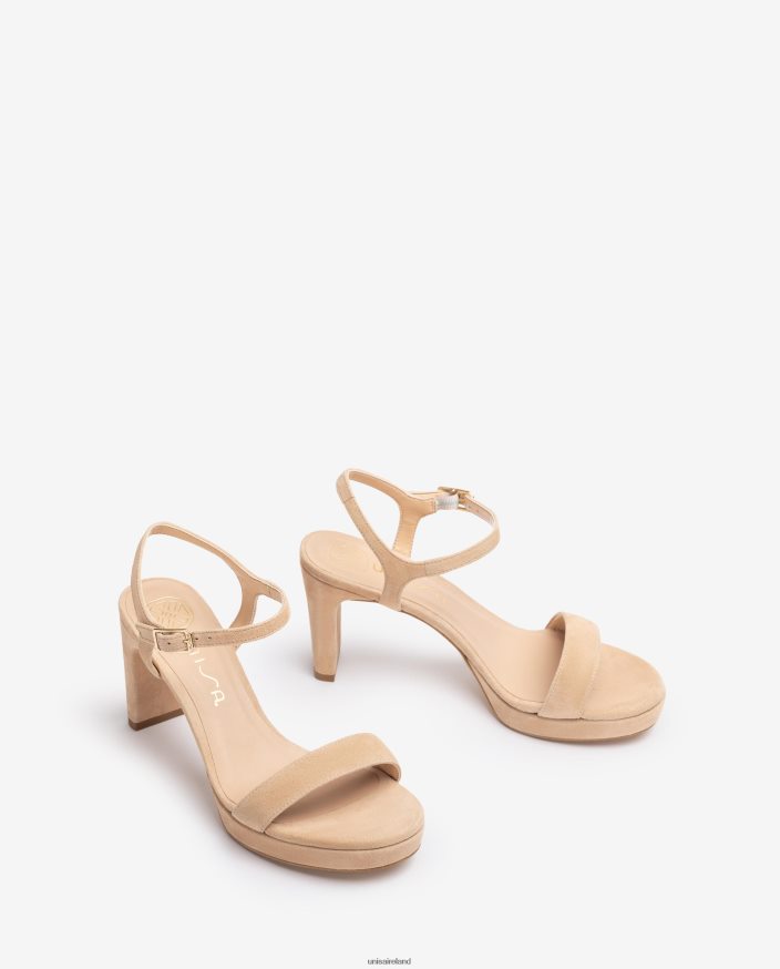 Round toe sandal made in suede. 8cm heel and 1cm platform covered in matching suede. Ankle strap that can be adjusted with the metal buckle and light, non-slip, rubber sole. Luxury handmade finishes.