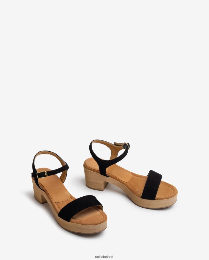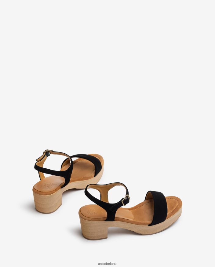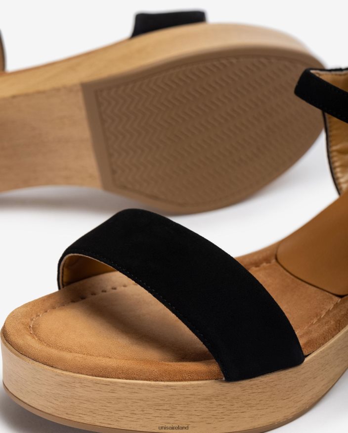 Round toe suede sandal. Ankle strap that can be adjusted with the metal buckle. Light 5.5cm high block heel and a 3cm wood effect platform. Light, non-slip, rubber sole. Unisa essence in its pure state.