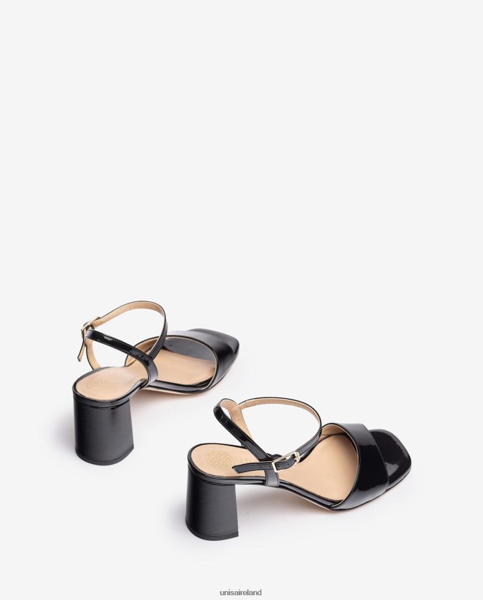 Square sole sandal made in patent leather. Wide 6cm heel in a matching tone. An ankle strap that can be adjusted using the metal buckle. Leather sole.