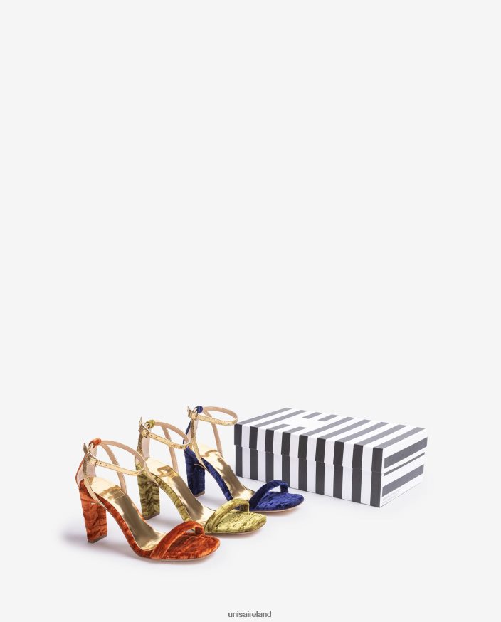Square sole sandal made in velvet. Thin golden ankle straps that can be adjusted using the metal buckle. 8.5 cm high heel covered with velvet. Leather sole. The new Unisa collection by Cherubina will captivate you with its perfection.
