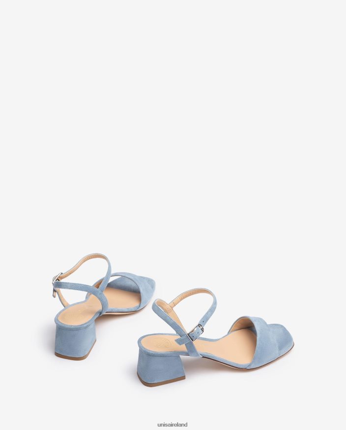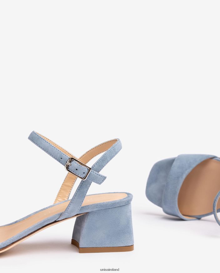 Square toe sandal made in suede. Matching tone wide heel 5cm high. Ankle strap that can be adjusted using the metal buckle. Leather sole. Essential Unisa classics that are revamped each season.