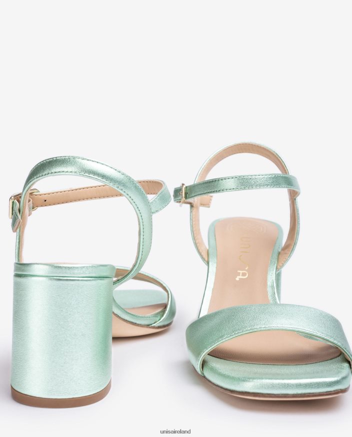 Square sole sandal made in metallic effect leather. Wide 6cm heel in a matching tone. An ankle strap that can be adjusted using the metal buckle. Leather sole.
