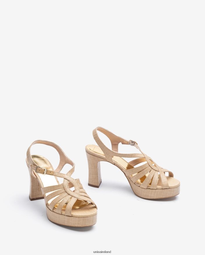 Round toe sandal made in raffia. 3 cm platform and a 9 cm high heel covered in a matching tone of raffia. Light, non-slip rubber heel. Ankle strap that can be adjusted using the metal buckle. The new Unisa collection by Cherubina will captivate you with its perfection.