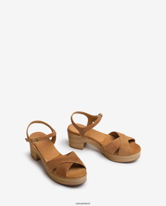Suede sandal with a medium height heel. Cross-over straps on the vamp and an ankle strap that can be adjusted using the metal buckle. 5.5 cm wood effect heel and 3 cm platform.