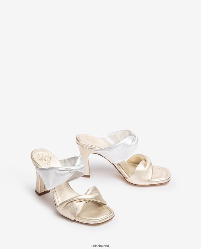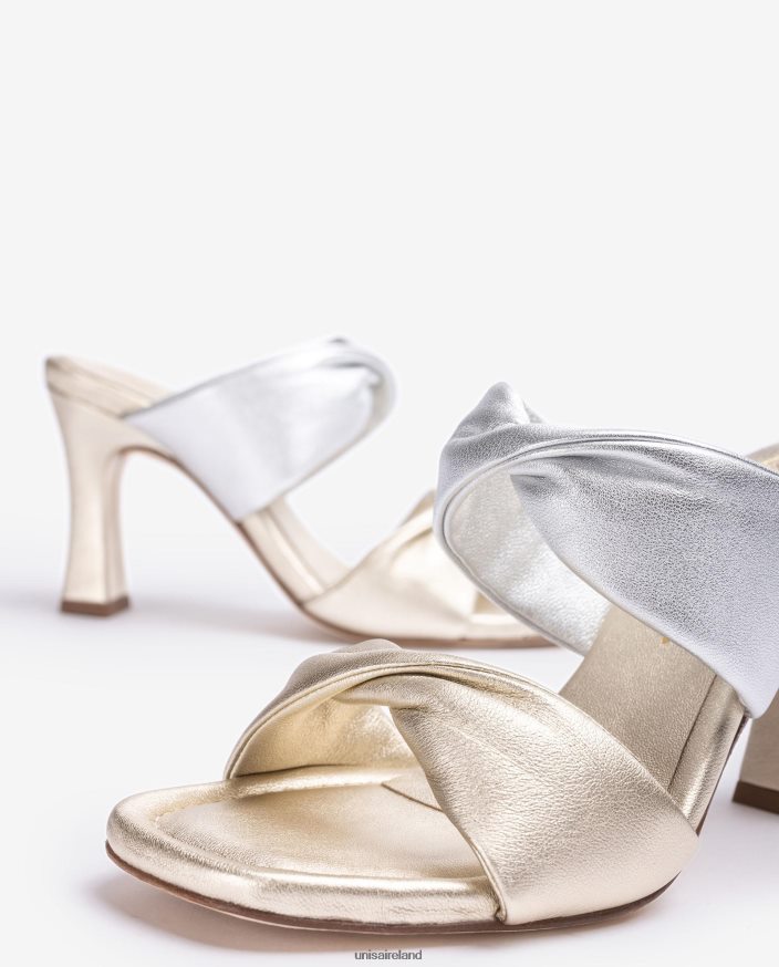Square toe sandal made in metallic effect leather. Matching wide twisted straps on the vamp and the front. 8cm matching square heel. Leather sole.