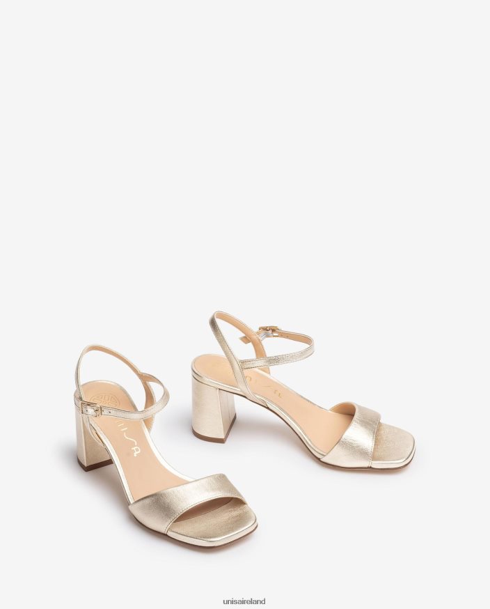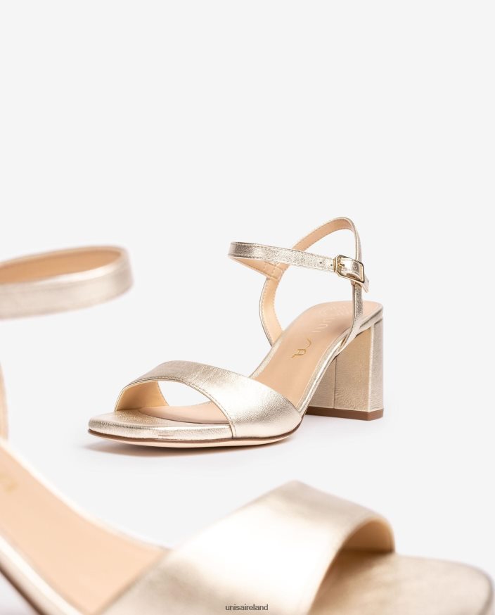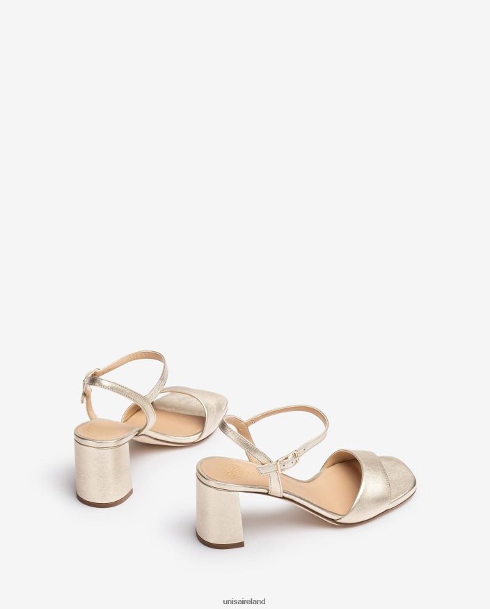 Square sole sandal made in metallic effect leather. Wide 6cm heel in a matching tone. An ankle strap that can be adjusted using the metal buckle. Leather sole.