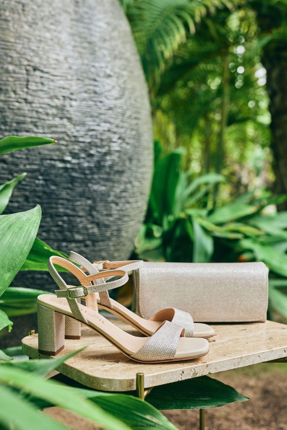 Sandals in shiny effect fabric. Adjustable metal buckle on the heel. Square sole lined in matching leather and wide 6cm high heel. Non-slip leather sole. A sensible heel sandals, designed for your day to day.