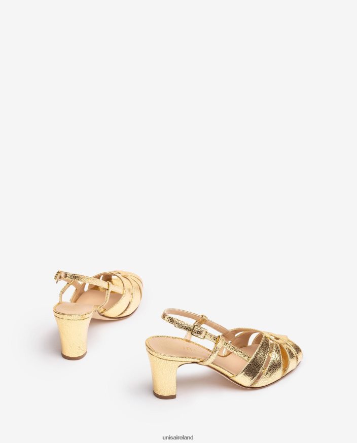 Square toe sandal made in metallic effect leather. 7cm matching tone heel. Leather sole. An ankle strap that can be adjusted using the metal buckle Elegance and finesse on your feet.