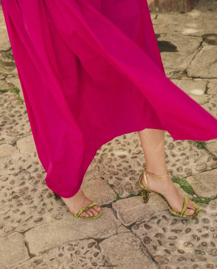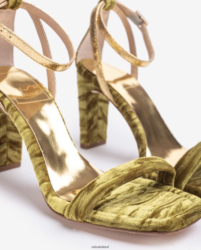 Square sole sandal made in velvet. Thin golden ankle straps that can be adjusted using the metal buckle. 8.5 cm high heel covered with velvet. Leather sole. The new Unisa collection by Cherubina will captivate you with its perfection.
