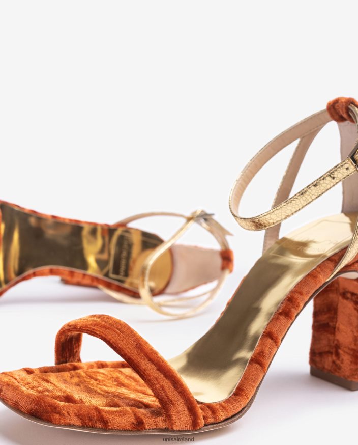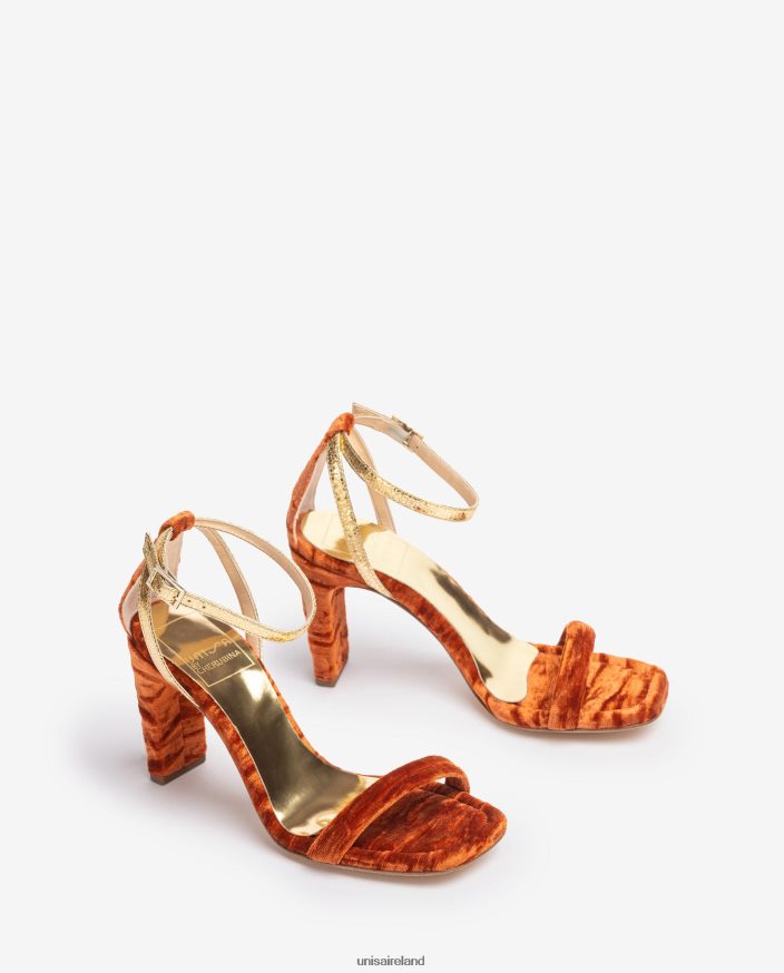 Square sole sandal made in velvet. Thin golden ankle straps that can be adjusted using the metal buckle. 8.5 cm high heel covered with velvet. Leather sole. The new Unisa collection by Cherubina will captivate you with its perfection.