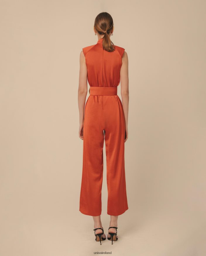 It is a straight-cut jumpsuit with shoulder pads. Slightly raised round neckline with a small opening at the upper cleavage area. Straight-cut trousers with a belt in the same fabric.
