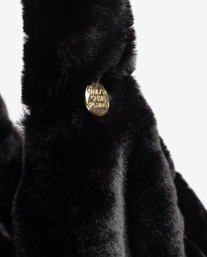 Medium size hobo bag made in recycled fur fabric. Magnetic snap closure and logo trim hanging on the handle. 31 cm x 35 cm x 17 cm