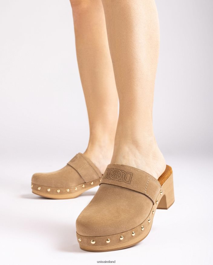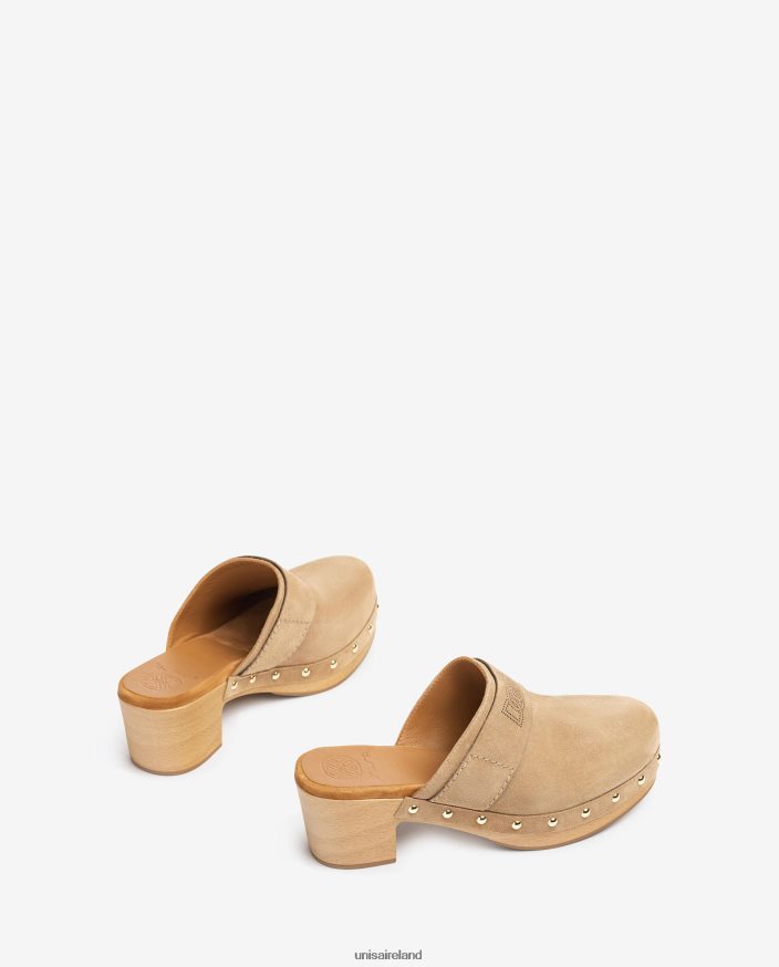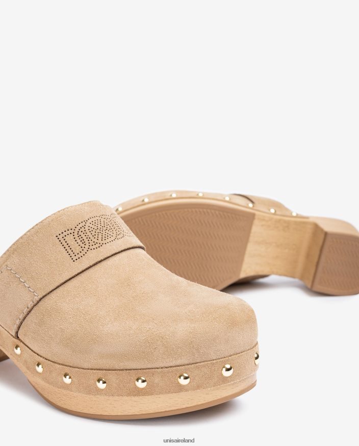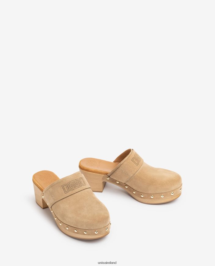 Round toe sandal made in suede. Light 5.5cm high wood effect block heel and a 3cm platform. Metal stud trim and a strap with geometric punching. Light, non-slip, rubber sole. Classics revamped for our new summer 2023 collection.