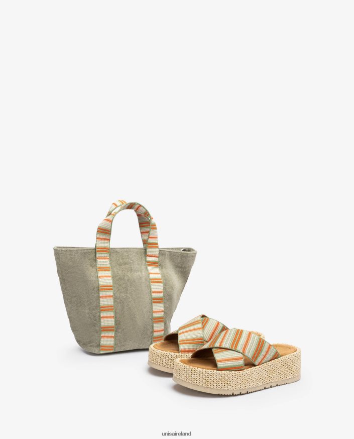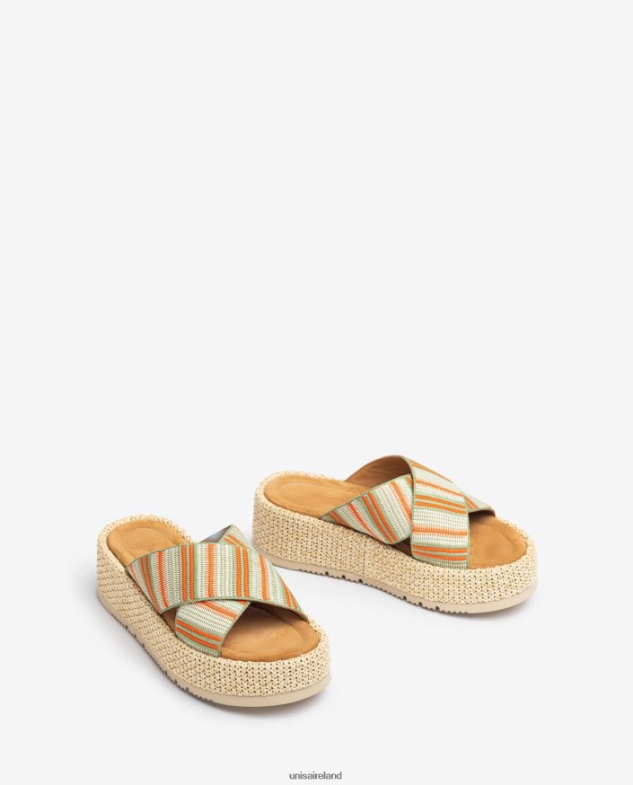 Round toe sandal with multicolour crossover straps. 4.5cm high block heel and a 3cm platform, covered in natural colour raffia. Thick foam in the whole sole for more comfort. Comfort brought to its full glory.