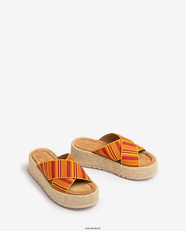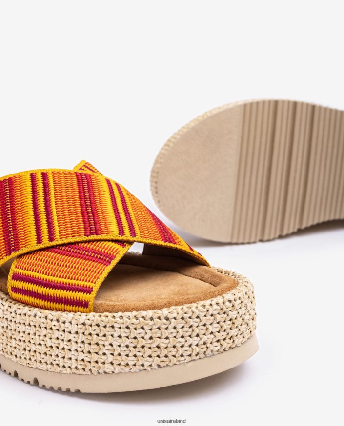 Round toe sandal with multicolour crossover straps. 4.5cm high block heel and a 3cm platform, covered in natural colour raffia. Thick foam in the whole sole for more comfort. Comfort brought to its full glory.