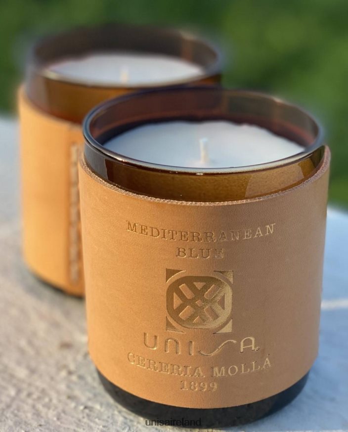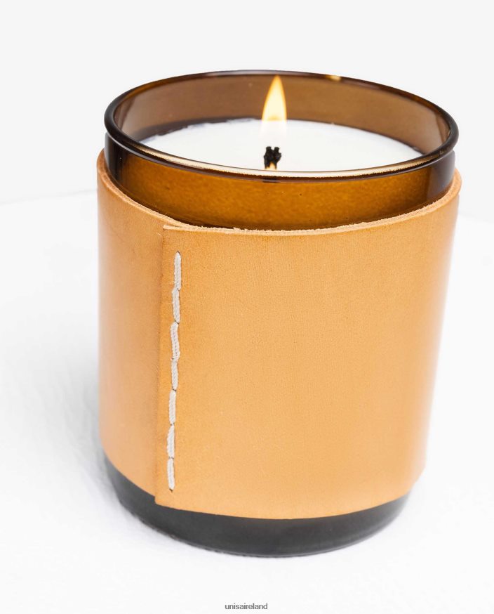 230grs. scented candle, 100% vegetable wax and 100% cotton wick. Amber coloured glass cup, cowhide embellishment, hand sewn and engraved with gold effect.