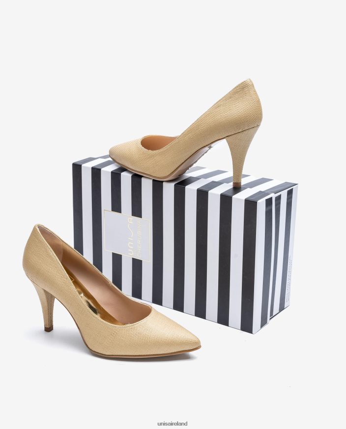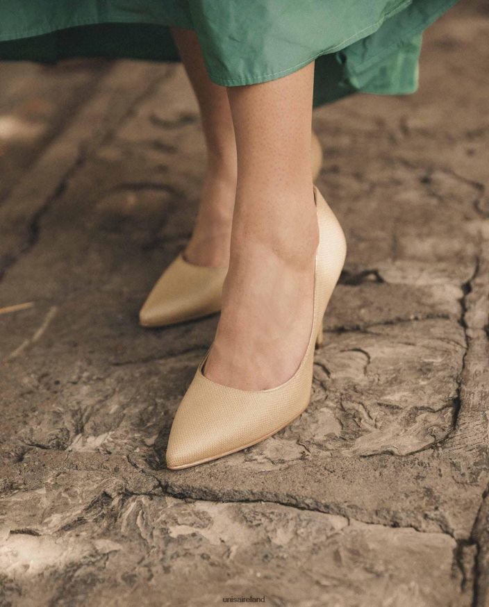 Pointed toe pump made in raffia. 8 cm high heel in a matching tone. Light, flexible, non-slip rubber sole. The new Unisa collection by Cherubina will captivate you with its perfection.