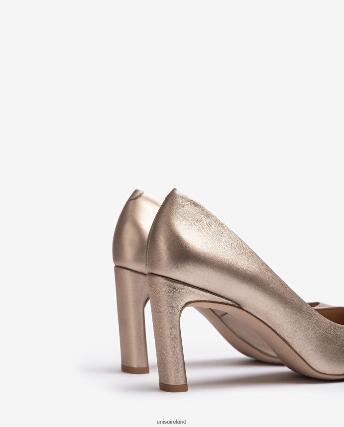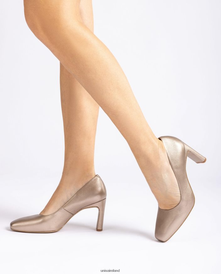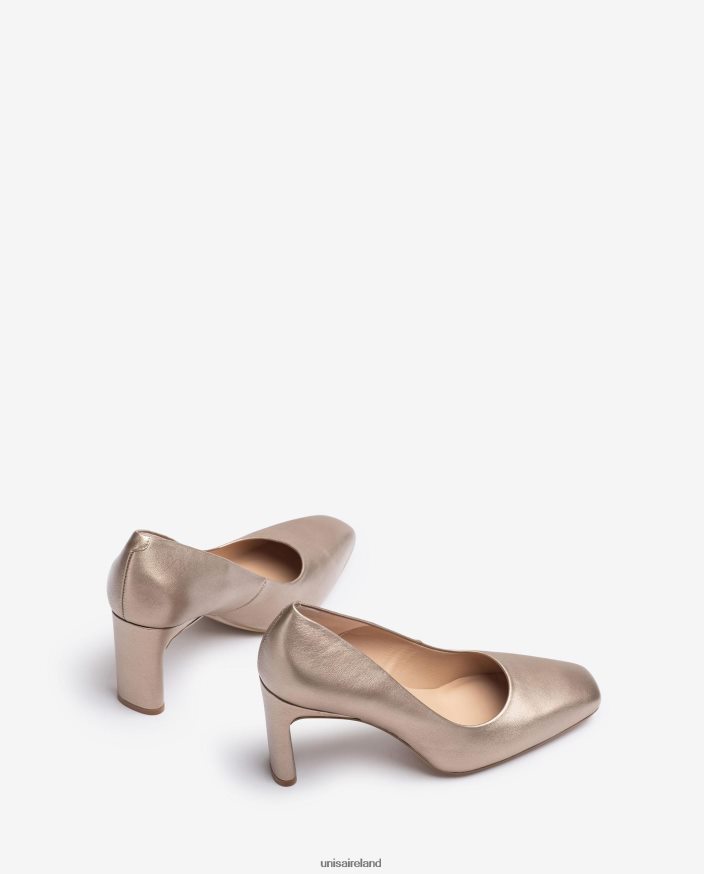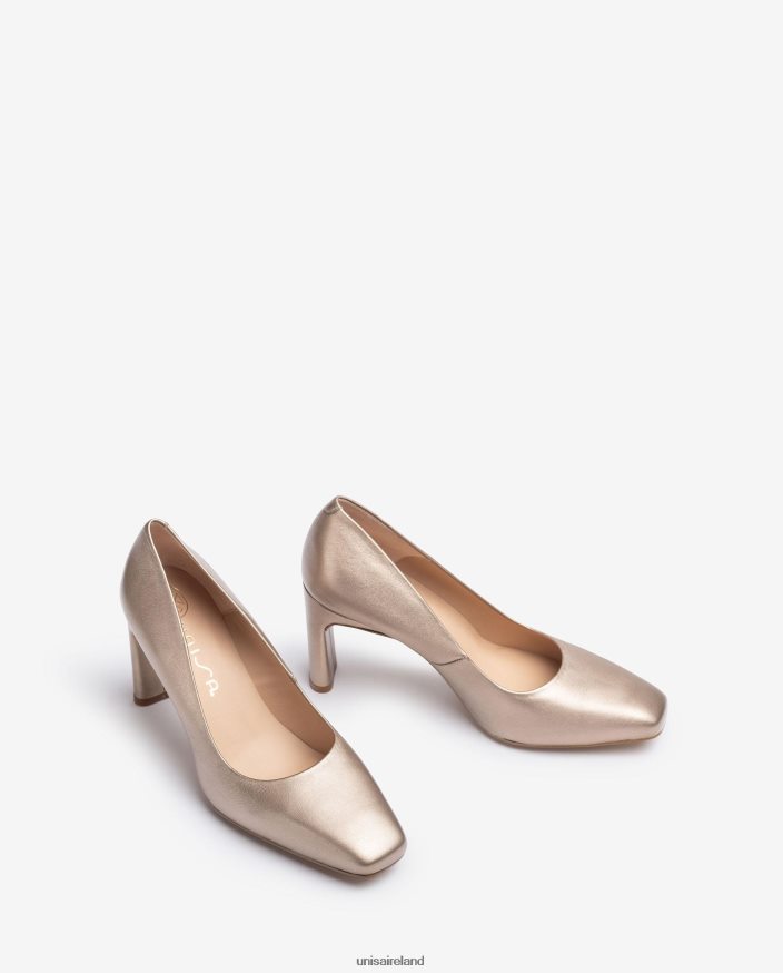Square toe pump made in metallic effect leather. Matching tone 7.5cm high heel. Light, flexible, non-slip, rubber sole. The design of the WABA model from Unisa will surprise you!