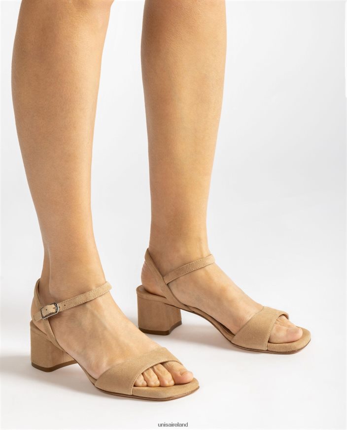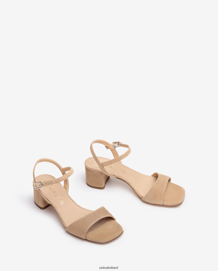 Suede sandal. Plain square vamp and ankle strap that can be adjusted using the buckle. Comfortable 4.5 cm heel and leather sole.