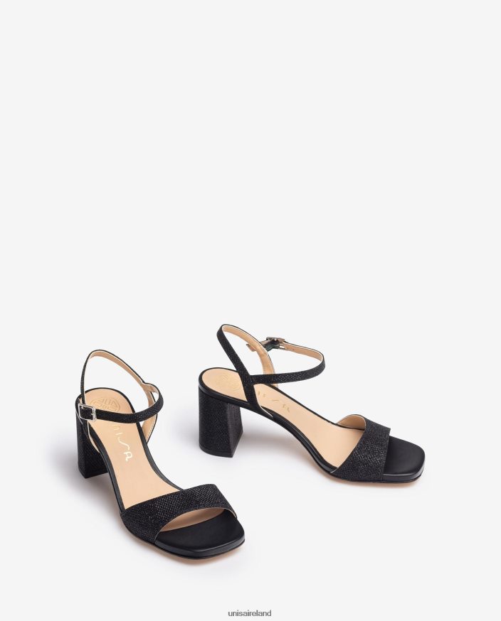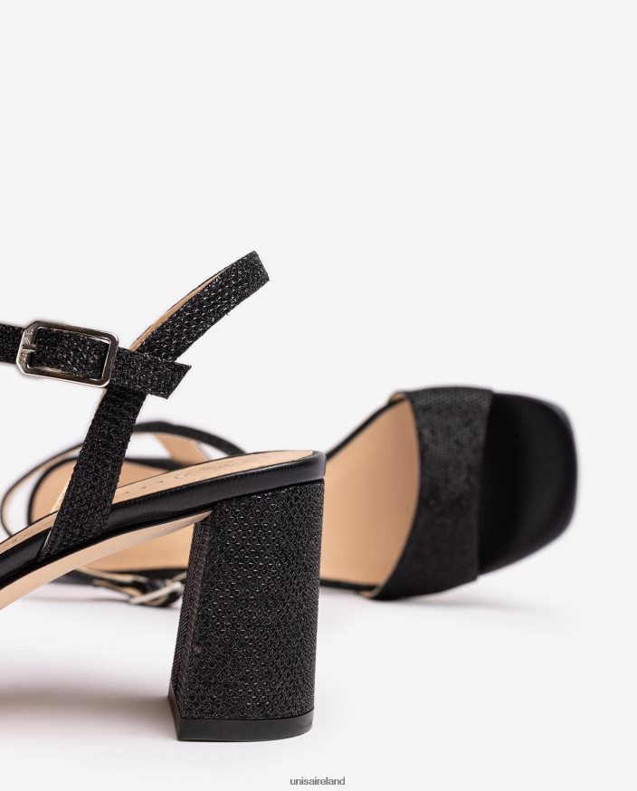 Square sole sandal made in shiny fabric. Wide 6cm heel in a matching tone. An ankle strap that can be adjusted using the metal buckle. Leather sole.