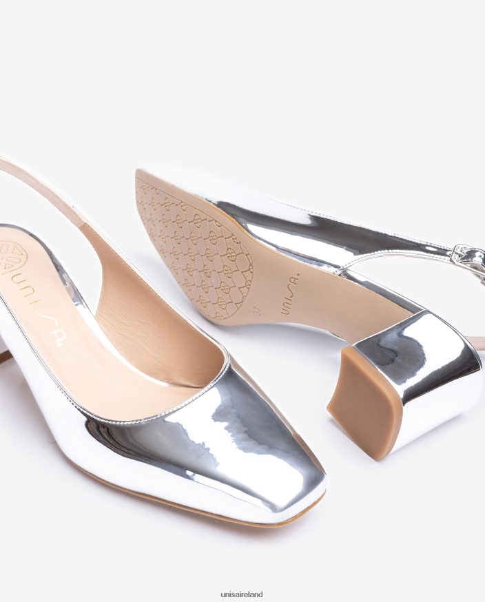 Square toe sling back made in mirror effect fabric. Matching tone 6cm wide heel. Light, flexible, non-slip, rubber sole. Essential Unisa classics that are revamped each season.