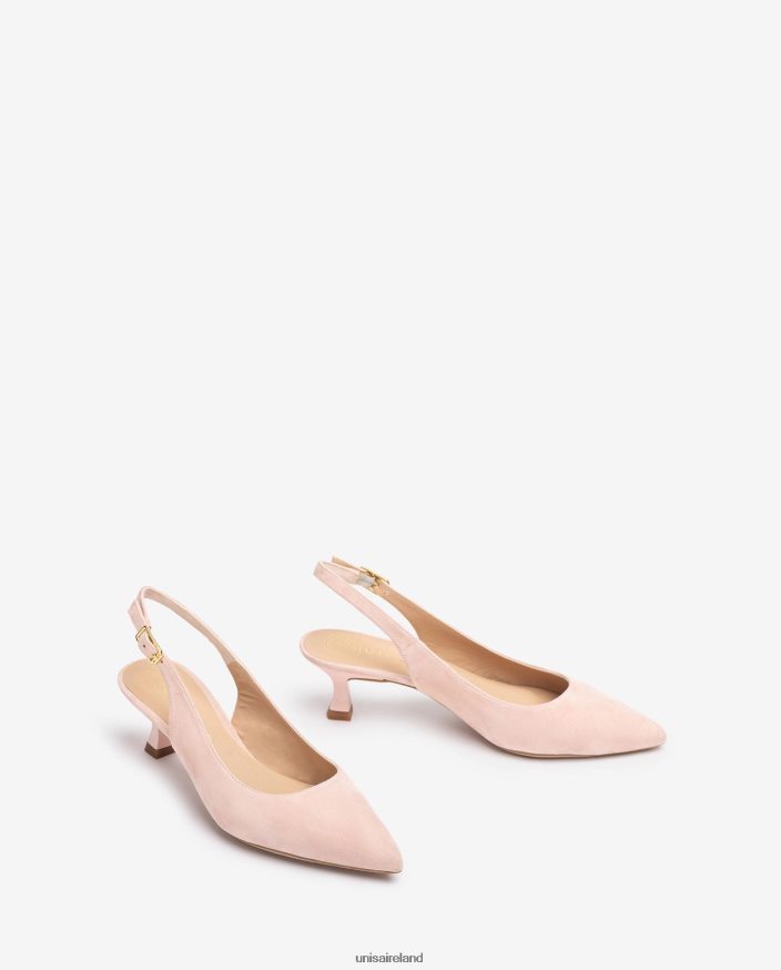 Pointed toe suede sling back shoe. 5cm high slim heel in a matching tone. Ankle strap that can be adjusted with the metal buckle. Light, flexible, non-slip, rubber sole. Versatility and elegance in its pure state.