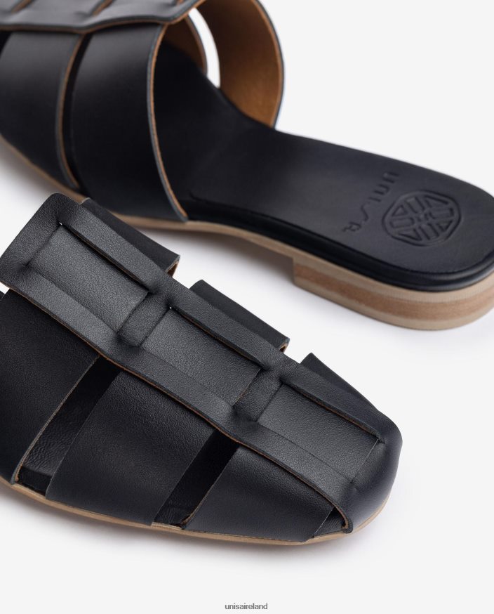 Leather mule style flat sandal. Strap trim in the centre and decorative perforations on both sides. Flexible, rubber, non-slip sole. The Unisa summer collection will be your best accessory!