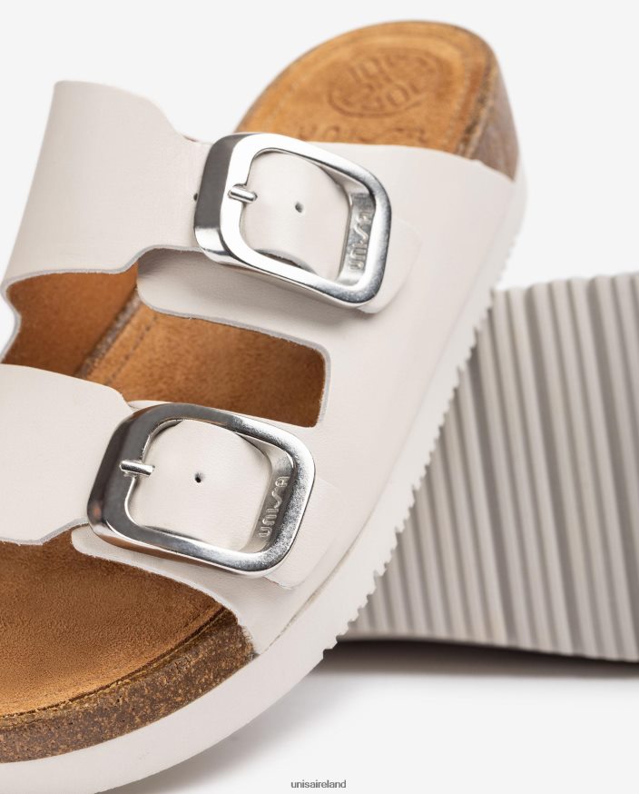 Flat leather sandal. Double strap trim on the vamp with metal buckles. 3 cm cork platform and a non-slip, light and flexible rubber sole.