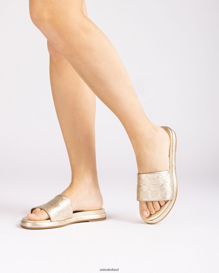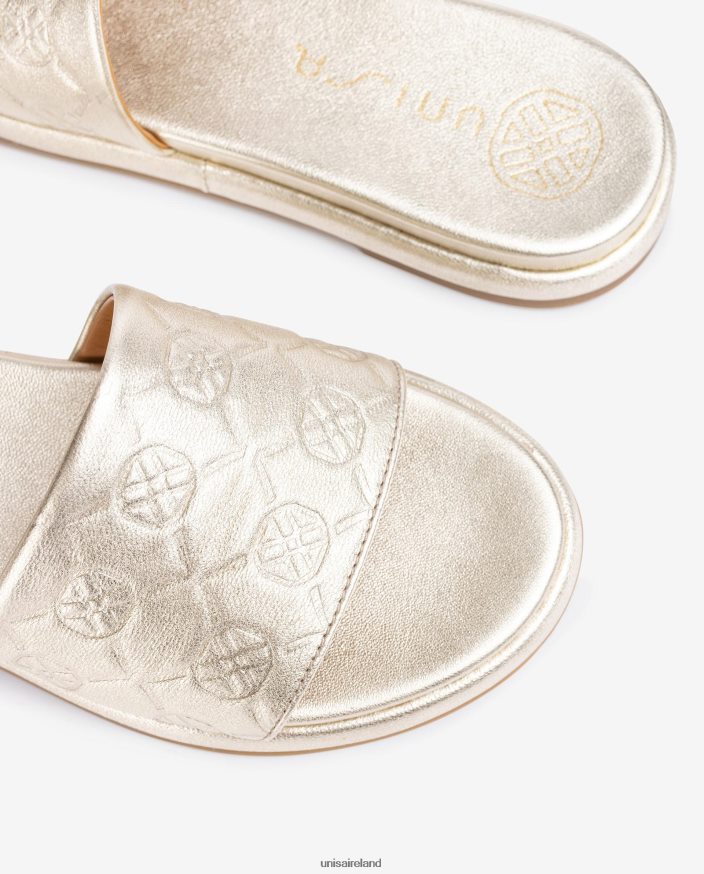 Round toe flat sandal made in metallic effect leather. Wide vamp with a matching monogram embossed on it. Light, flexible, non-slip, rubber sole. Design and comfort will accompany you in all your steps.