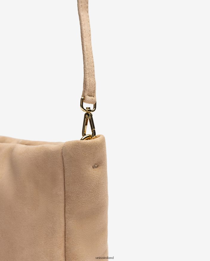 Small suede handbag. Metallic effect leather handle with trim. Adjustable crossbody strap made in matching colour suede. Magnetic snap closure. Size: 16cm x 19cm x 6cm