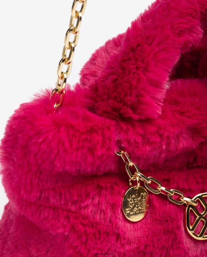 Small mini bag made of recycled soft pile fabric. Chain trim and zip fastening. Cross-bag shoulder strap inside. 14cm X 22cm X 9cm