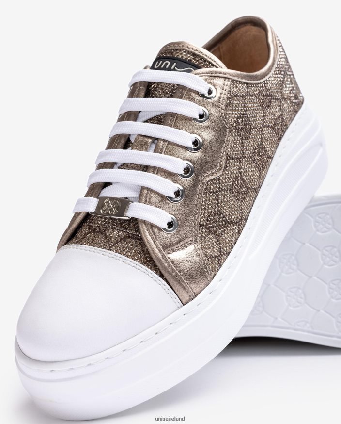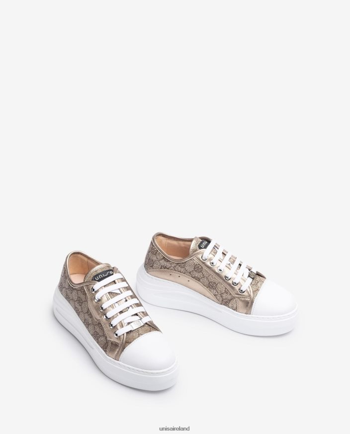 Sneakers made in shiny fabric with a monogram and contrasting metallic effect leather. White leather toe. Removable insole made with the SuperSoft technology that makes each step you take more comfortable. 4cm platform sole with volume. Our sneakers will be an essential part of your wardrobe.