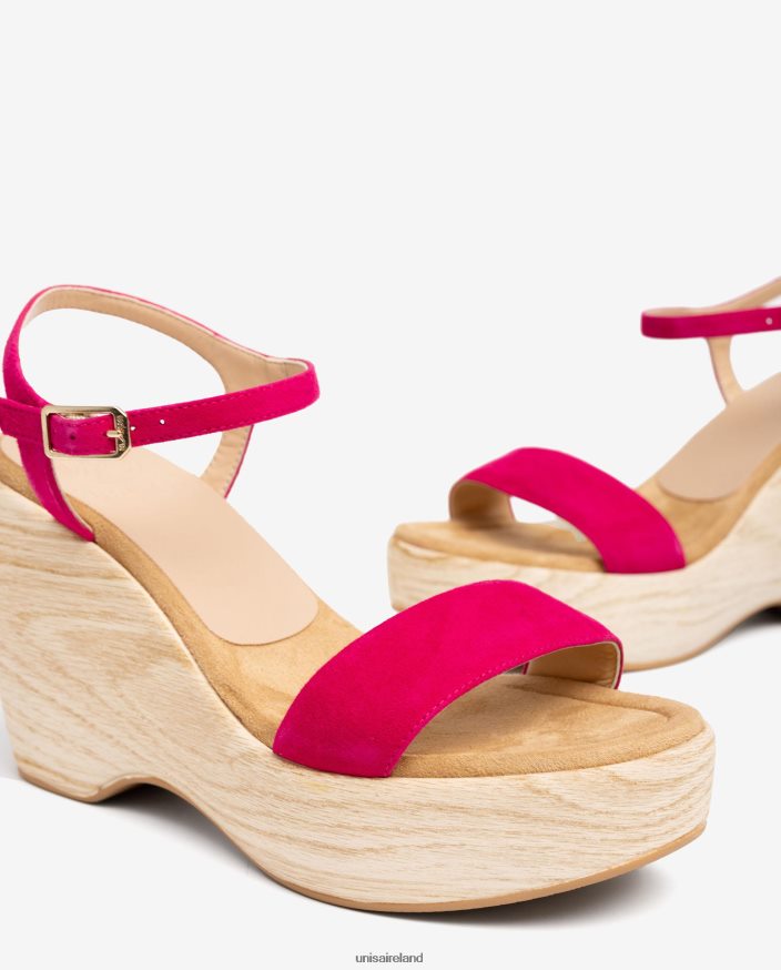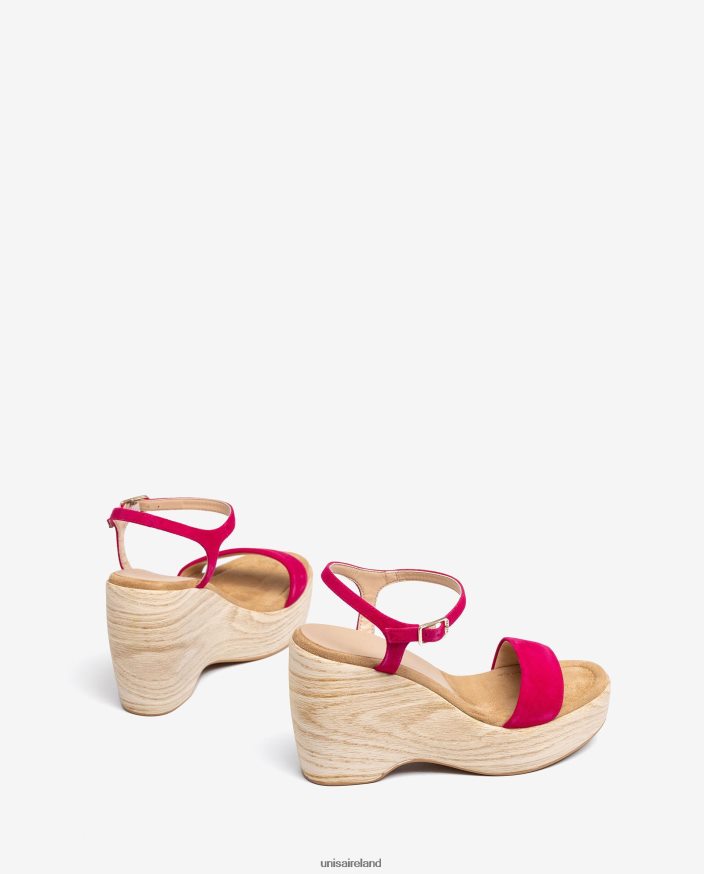 Suede sandal in various colours, a strap on the instep that can be adjusted with the metal buckle. PU wood effect block with an 10cm heel and a 4cm platform. UNISA essence in its pure state.